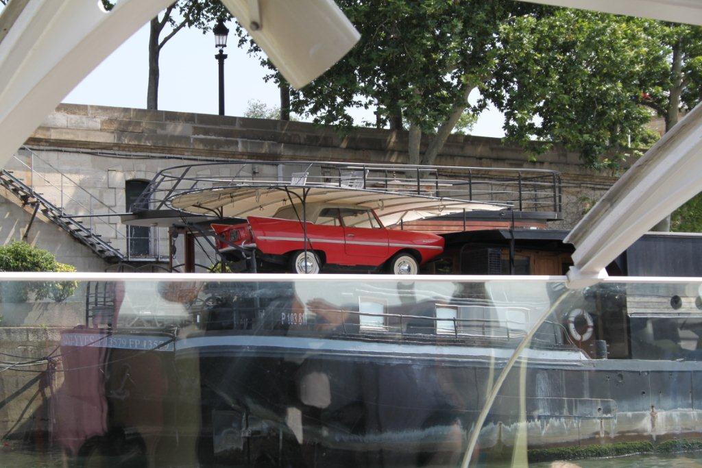 Une voiture amphibie sur une péniche