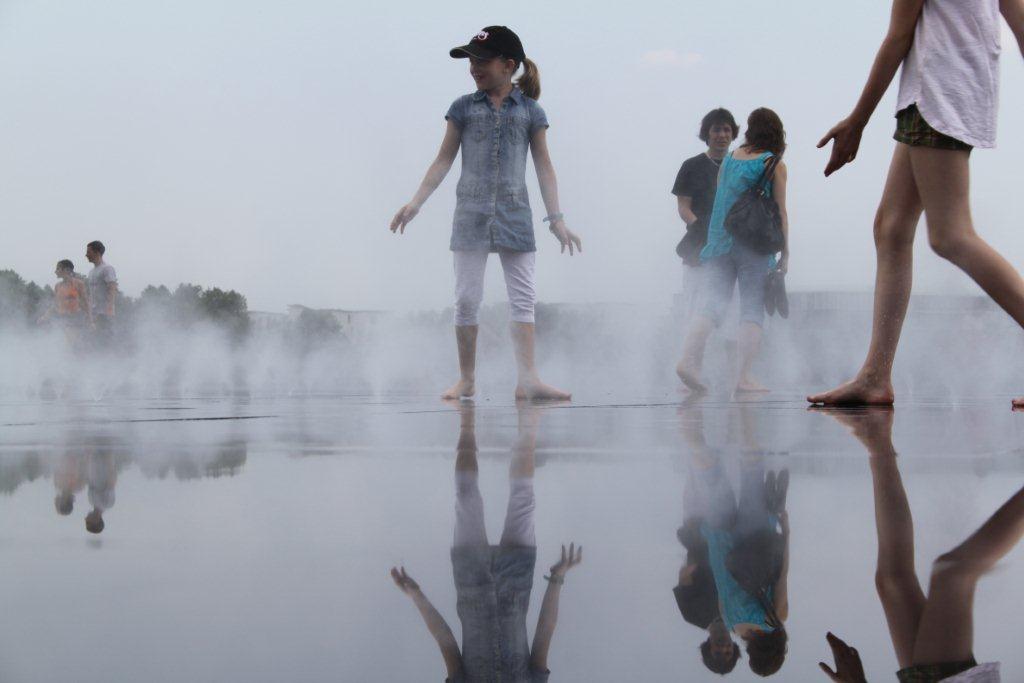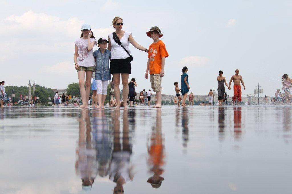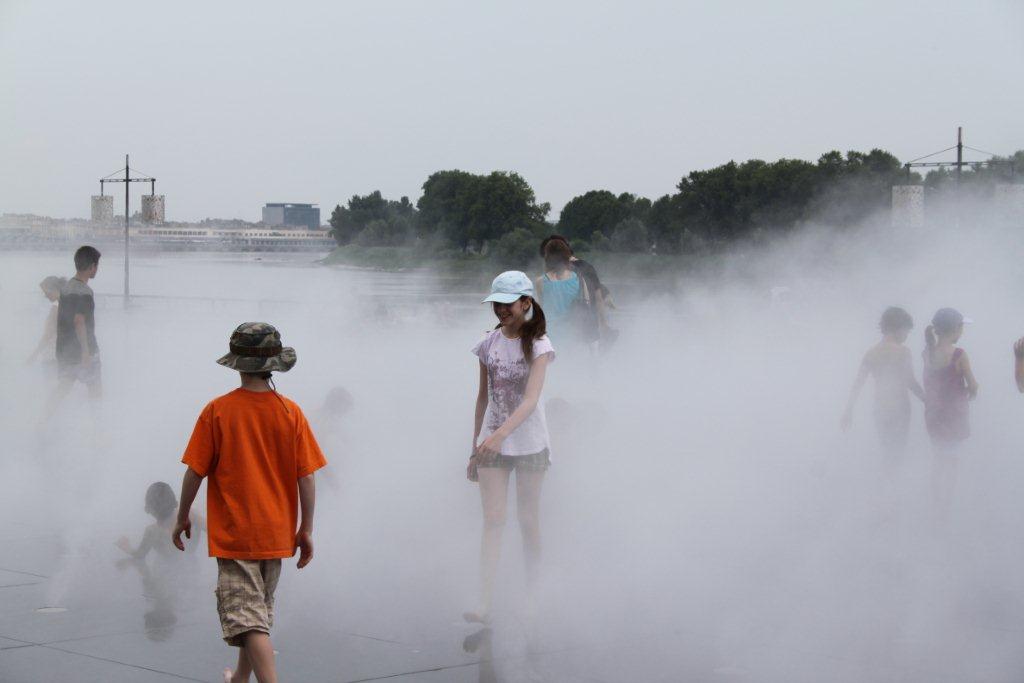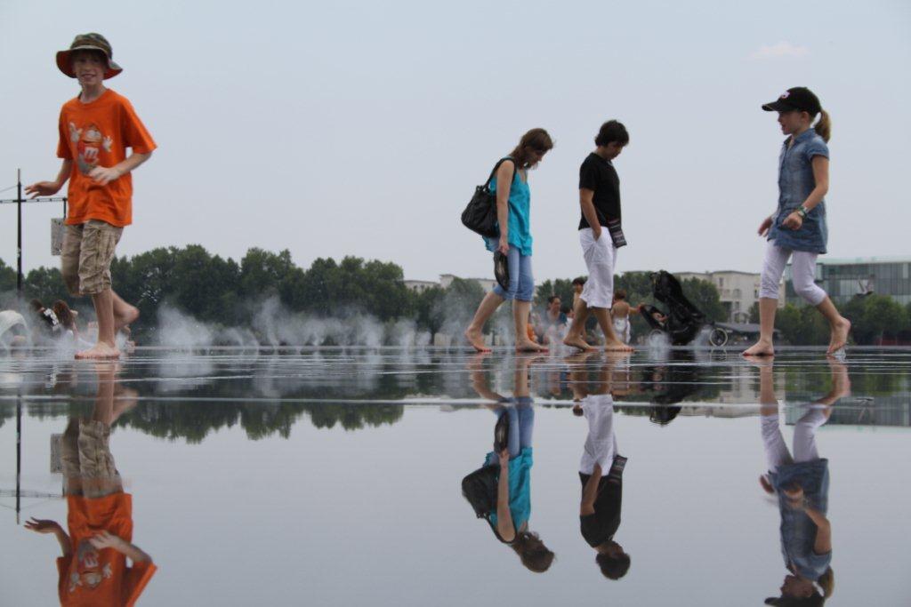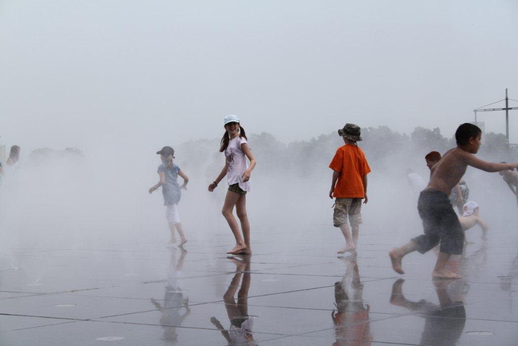 Les enfants ont appréciés le «mirroir d’eau» aménagé devant la place de la bourse où ont peu se rafraichir quand c’est la canicule comme aujourd’hui. Il doit bien faire 35-36 degré.