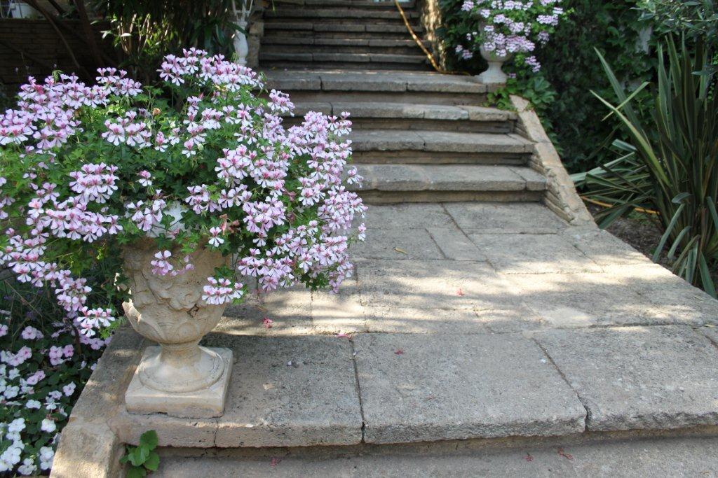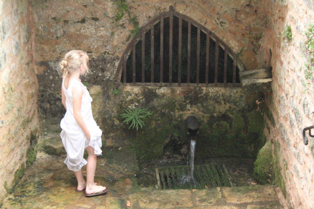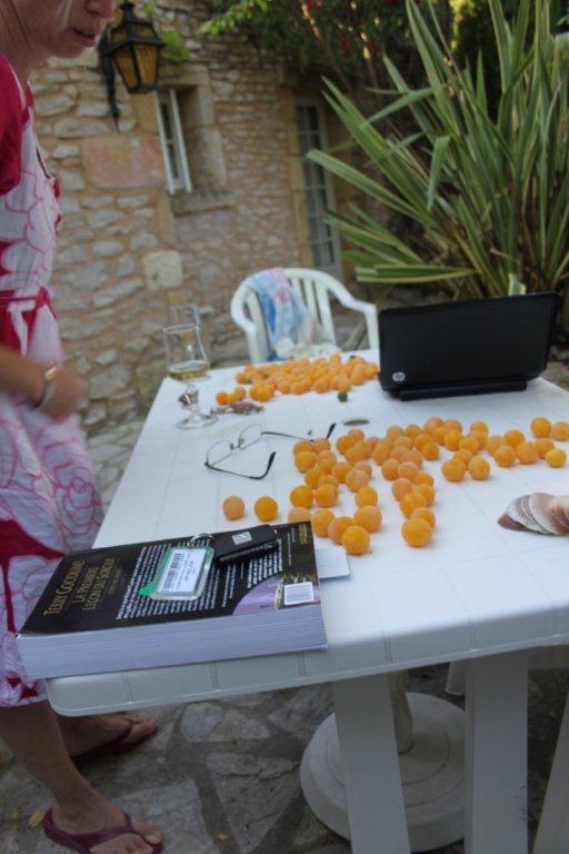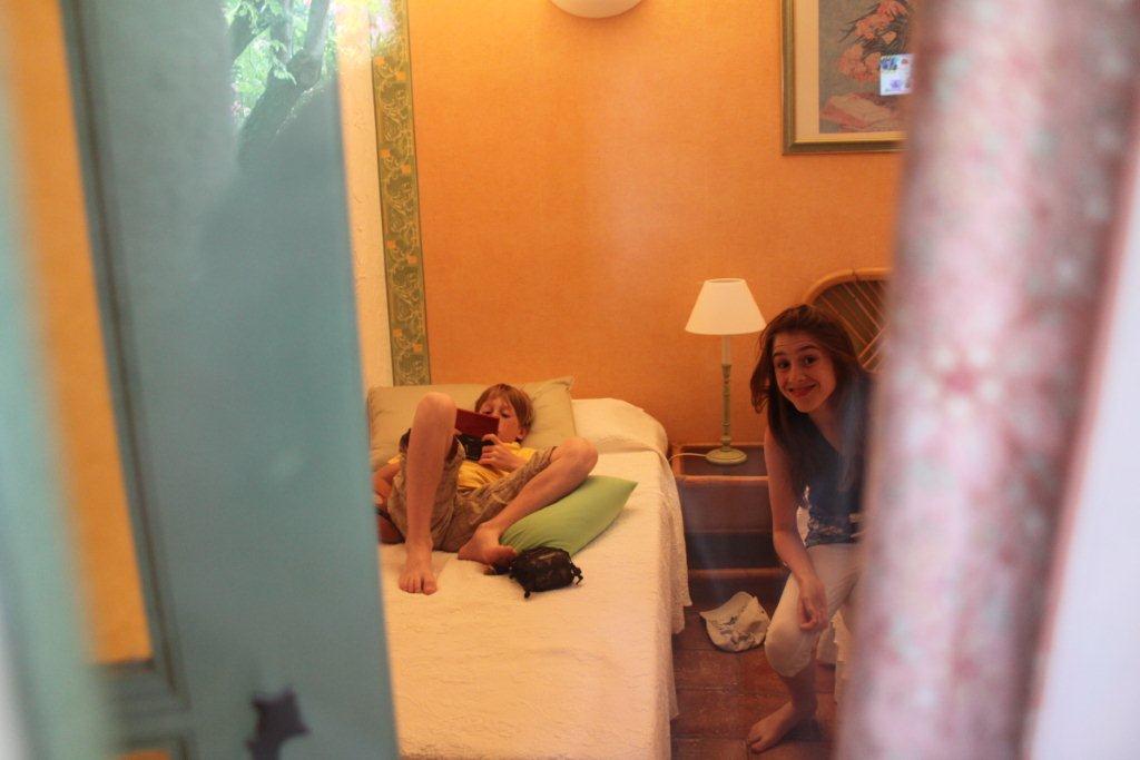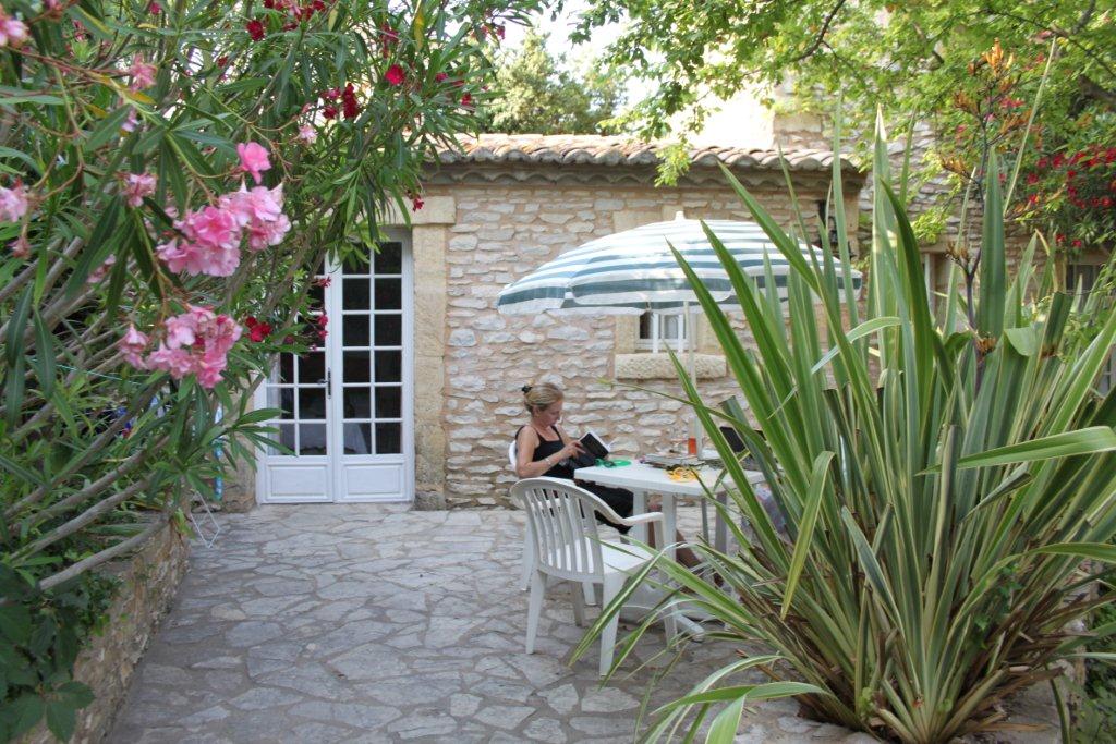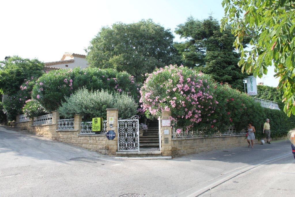 La voilà rassurée, c’est le Jack-Pot ! L’« Enclos des lauriers roses» est composé d’un petit pâté de maisons au milieu d’un ancien village rénovées avec le confort moderne. La cours intérieure a été aménagée avec trois piscines dont l’une se déverse dans une autre par un cascade. Il faut visualiser qu’ici en France la topographie n’est jamais plane. Tout est en relief . Habituellement, on retrouve les anciens villages au haut des collines et les nouveaux développements plus bas. Ce qui est remarquable de notre auberge c’est la quantité d’arbustes à fleurs. On se croirait dans un jardin botanique. Devant notre porte, il y a un prunier dont j’achève de manger les fruits. C’est l’Éden.