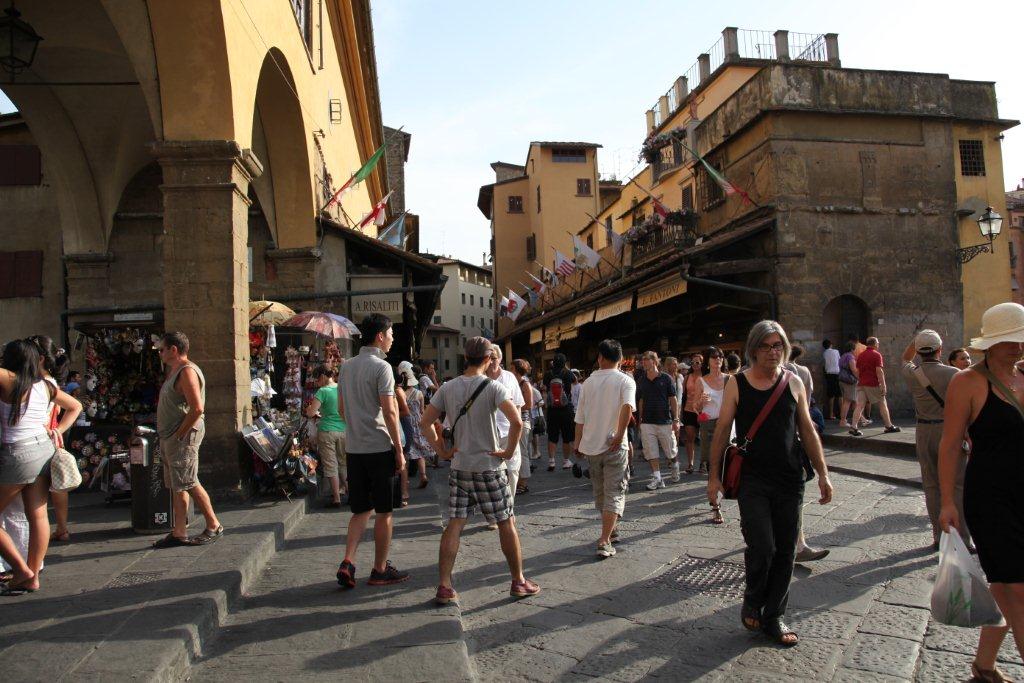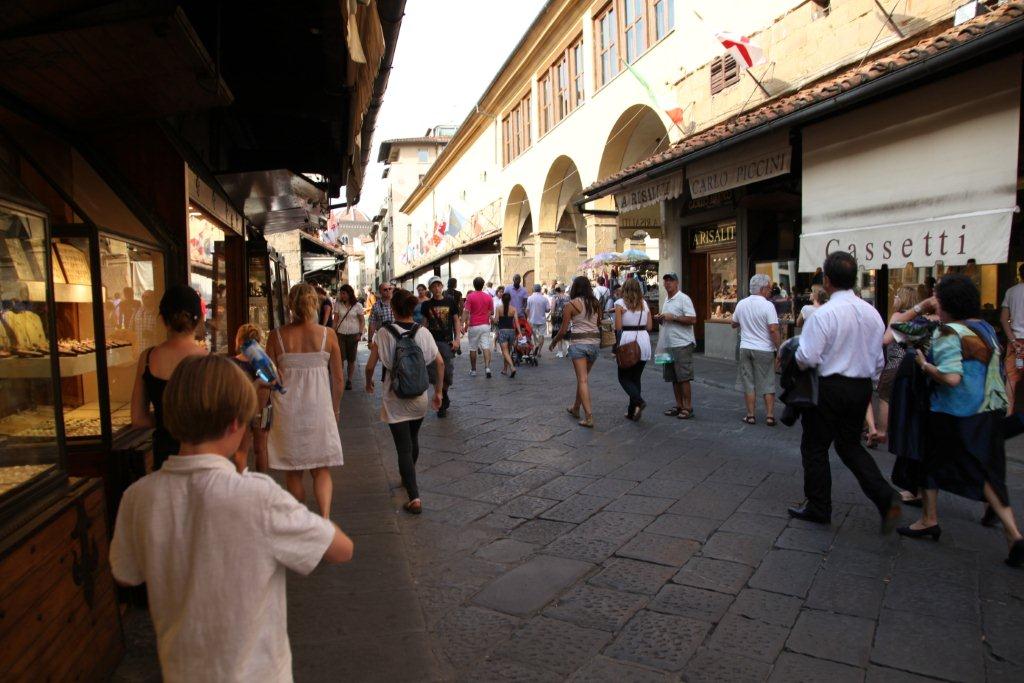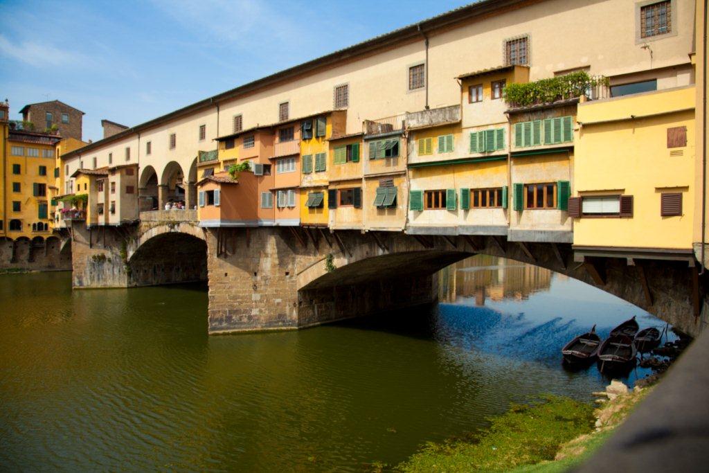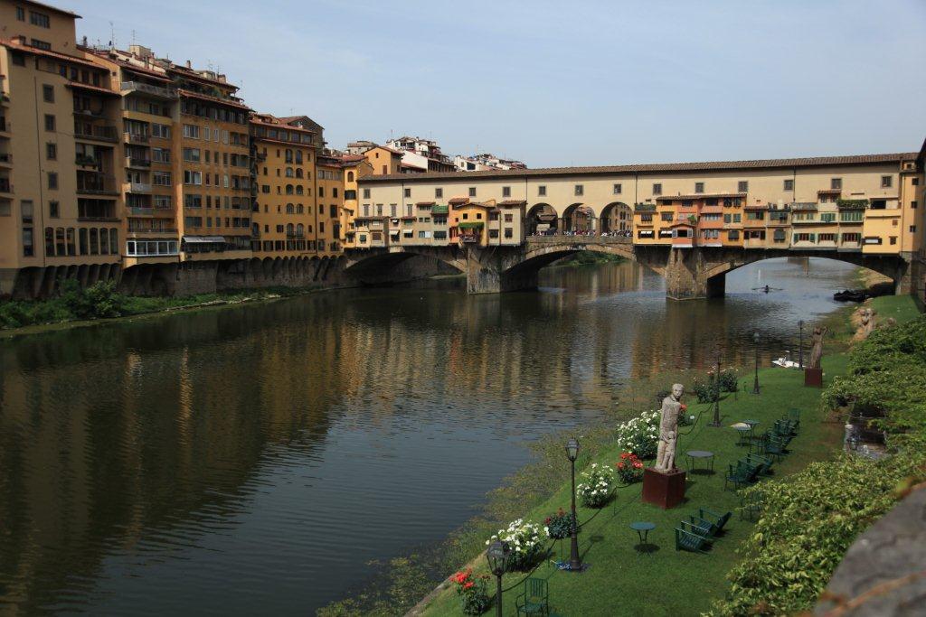Le Ponte Vecchio (vieux pont), seul pont épargné de dynamitage par les Allemands pour protéger leur retraite. Il abrite des joailliers et des orfèvres. Les Médicis, riches familles de l’époque, firent construire le corridor qui surmonte les boutiques afin de circuler entre leurs palais sans se mêler à la foule.